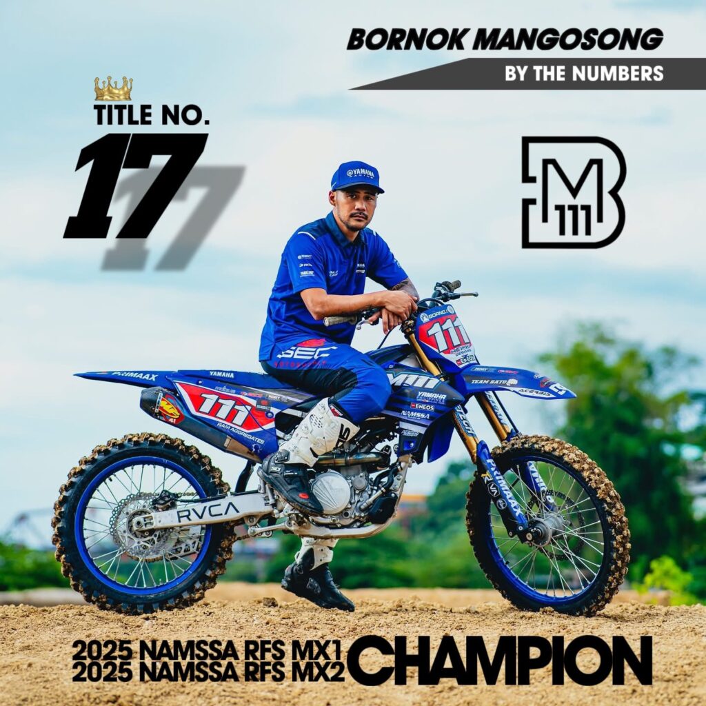 Bornok Mangosong’s 17 Major National Titles Mark One of the Most Decorated Careers in Philippine Motocross December 25, 2025 Photo Credit: BM111 Powersports Bornok Mangosong’s 17 Major National Titles Mark One of the Most Decorated Careers in Philippine Motocross MANILA, Philippines — Bornok Mangosong’s competitive résumé is highlighted by 17 major national championships, a total that places him among the most accomplished riders in the history of Philippine motocross. The titles span more than a decade and reflect sustained success across Supercross and Motocross disciplines, multiple engine classes, and various sanctioning bodies. Mangosong’s rise to the top began with his breakthrough MXMessiah Motocross title in 2013, marking the start of a period of sustained dominance at the national level. He would go on to collect major overall championships in NAMSSA Pro Lites and Pro Open, the MMF Supercross Series, the Davsons Motocross Series in both 250cc and 450cc categories, and the Motor Ace Motocross Series, contributing to his total of 17 national crowns. His most recent achievements came in 2025, when he secured both the NAMSSA–RFS MX1 Overall National Championship and the Lites Overall National Championship, reaffirming his competitiveness in the premier class. In addition to his championship success, Mangosong has earned multiple Rider of the Year honors from NAMSSA, including recognition through the Ernie Leongson Rider of the Year Award, which acknowledges overall performance, consistency, and contribution to the sport. On the international stage, Mangosong has represented the Philippines at the Motocross of Nations World Championship in 2022 and was selected for the FIM Asia Team MX of Nations in 2025, highlighting his standing beyond domestic competition. With 17 major national titles earned across different eras and formats, Bornok Mangosong’s career résumé reflects longevity, adaptability, and sustained excellence at the highest level of Philippine motocross. bornok Mangosong, coach sam tamayo, Mangosong wins his 17th major motocross title, mmf live Share this post Leave a Reply Cancel reply Logged in as mx_admin. Edit your profile. Log out? Required fields are marked * Message* Δ MORE ARTICLES
